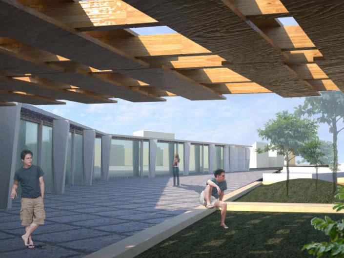 Ons doel werd daarom een architectuur voor een kant van het plein te ontwerpen en de ruimte van en onder het plein vorm te geven zodat op verschillende niveaus activiteiten konden plaatsvinden die voor zowel volwassenen als kinderen interessant konden zijn. Hierbij valt te denken aan een openluchttheater, een auditorium, een infopoint, een speelruimte voor kinderen bij een grasveld met fruitbomen, een winkelcentrum, een invulling kortom die het gebied een eigen karakter geeft.