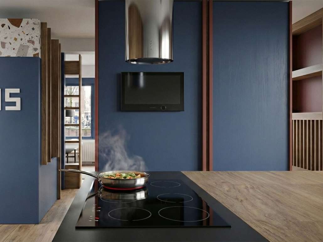 De keuken heeft niet alleen de functie om lekkere maaltijden klaar te maken, maar het is de plek voor gezelligheid. Terwijl je aan het aanrecht staat te werken, kun je makkelijk een blik op je iPad werpen voor een nieuw recept of samen met je vrienden kletsen, met een wijntje erbij… In deze ruimte heb je alles bij de hand en alles zal werken zoals het moet. De wastafel, een brede werkblad, een oven, de magnetron en een koelkast worden langs de muur gepositioneerd, terwijl de fornuis en de eettafel zijn in een eiland samengesteld. De keuze om een vierkant eiland werd bepaald door de vorm van de ruimte.